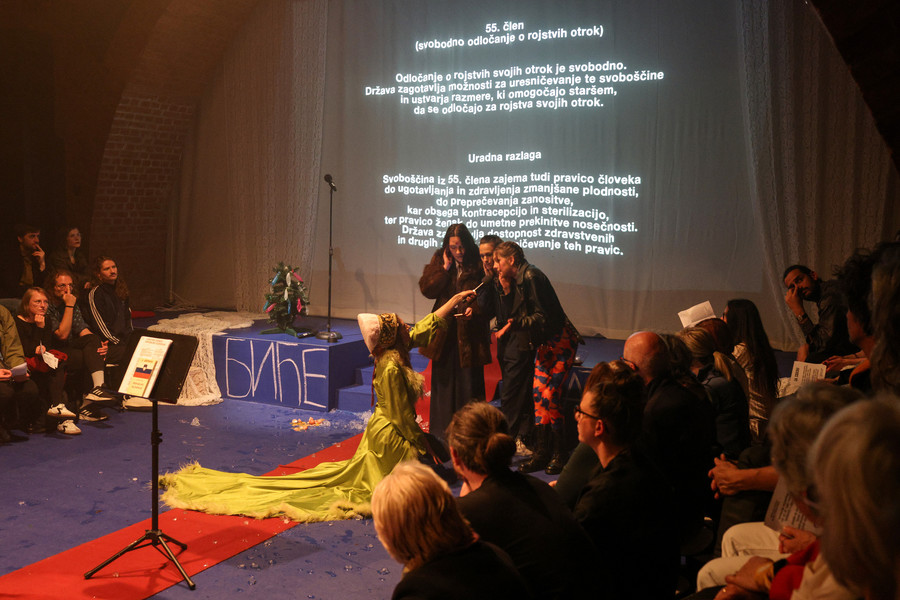 Predstava gradi iz arhivov, pričevanj in kolektivnega spomina na boje za reproduktivne pravice: kako so se politične odločitve, medicina, moraliziranje in intimne izkušnje žensk prepletale v javni spor. Namesto muzejske lekcije je to živa, frontalna odrska razprava o svobodi, telesu in državi – ter o tem, kaj pomeni pravica, če zanjo ni pogojev. [… P]olitično naredi osebno – in papirnate svoboščine spremeni v živo, konfliktno resničnost.